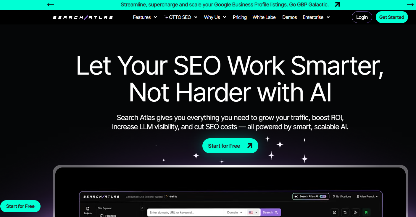 Search Atlas is an advanced AI-powered SEO and marketing automation platform designed for agencies and brands to automate and scale their online visibility. With its flagship “OTTO SEO” engine, it automates keyword optimization, on-page audits, internal linking, and reporting—reducing manual SEO work by up to 90%. It also includes tools for AI content generation, link building, GBP management, and visibility tracking in AI-driven search results.