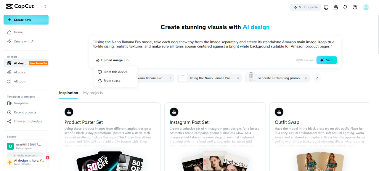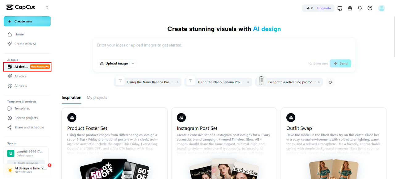 Step 1: Launch the Design Panel Access the CapCut platform and complete signup. Head to the "AI design" tab found under the "AI tools" menu. This is the main workspace where Nano Banana Pro supports fast and professional thumbnail creation.