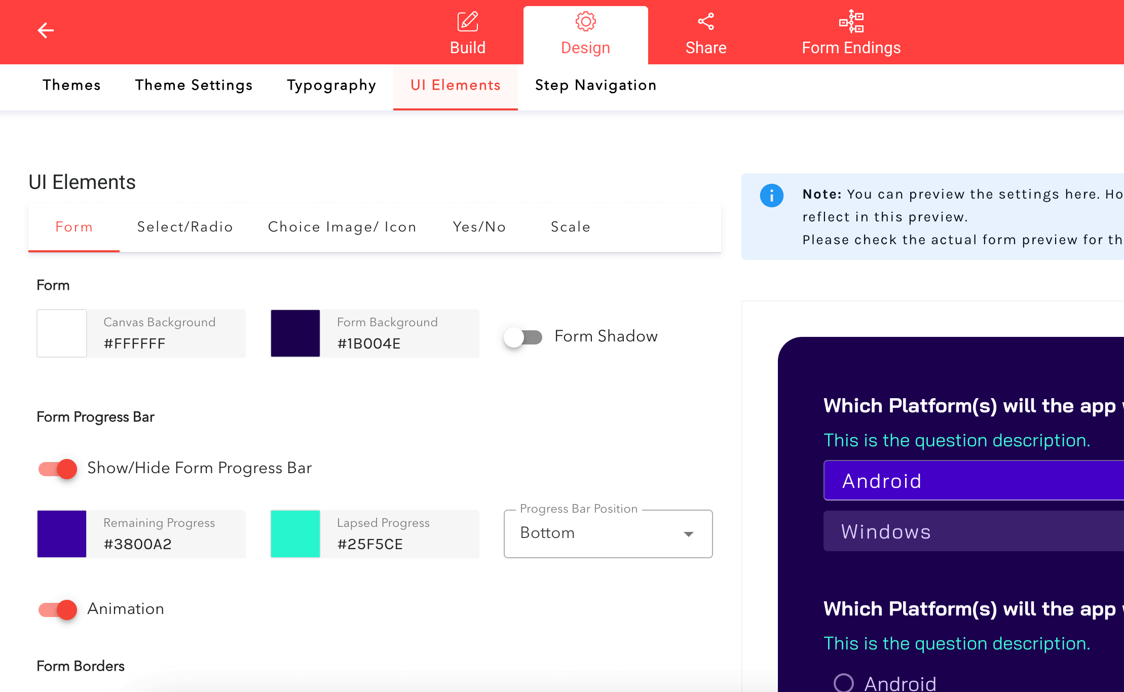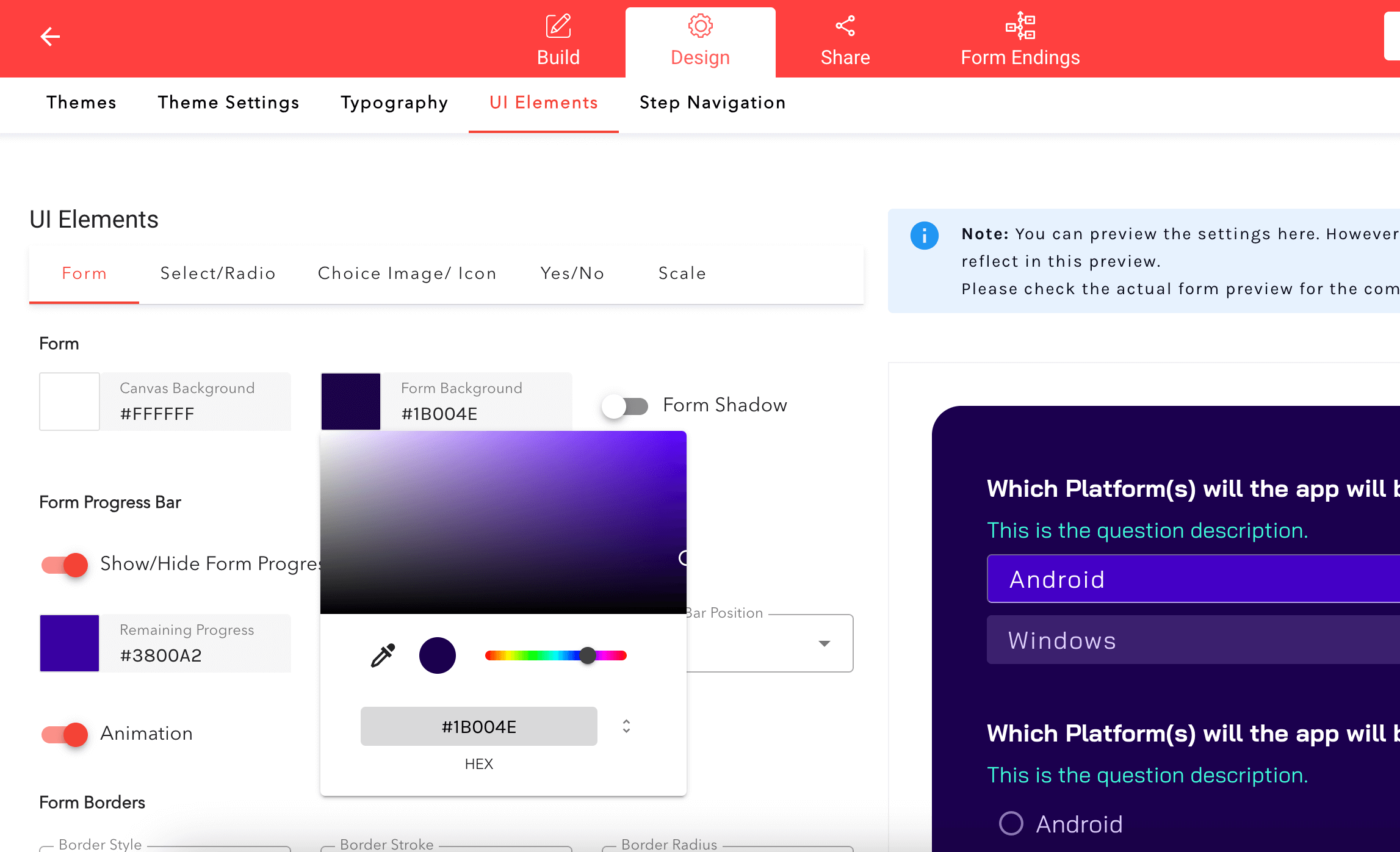 3. Then click on UI Elements, Form, Form Background Color. You can change the design by clicking on the color selector or typing in the hex code.
