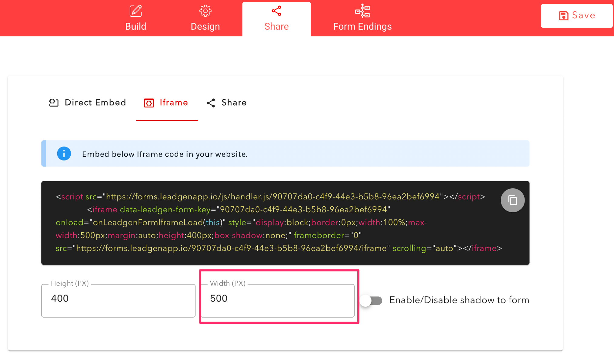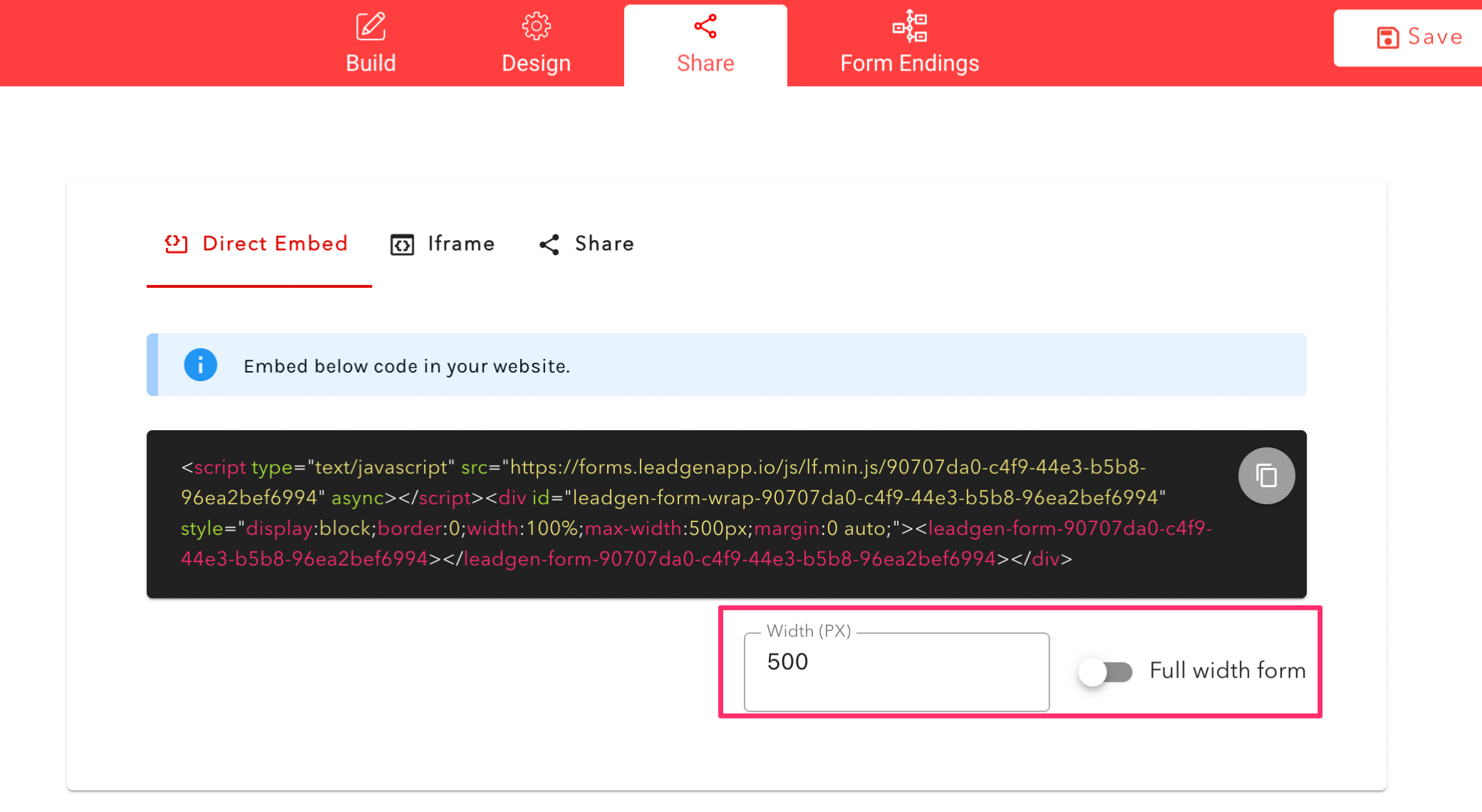 2. Both the direct embed and the I-frame code allow you to change the form width. Open the form in the builder, go to the “Share” tab, and make changes to the embed code.