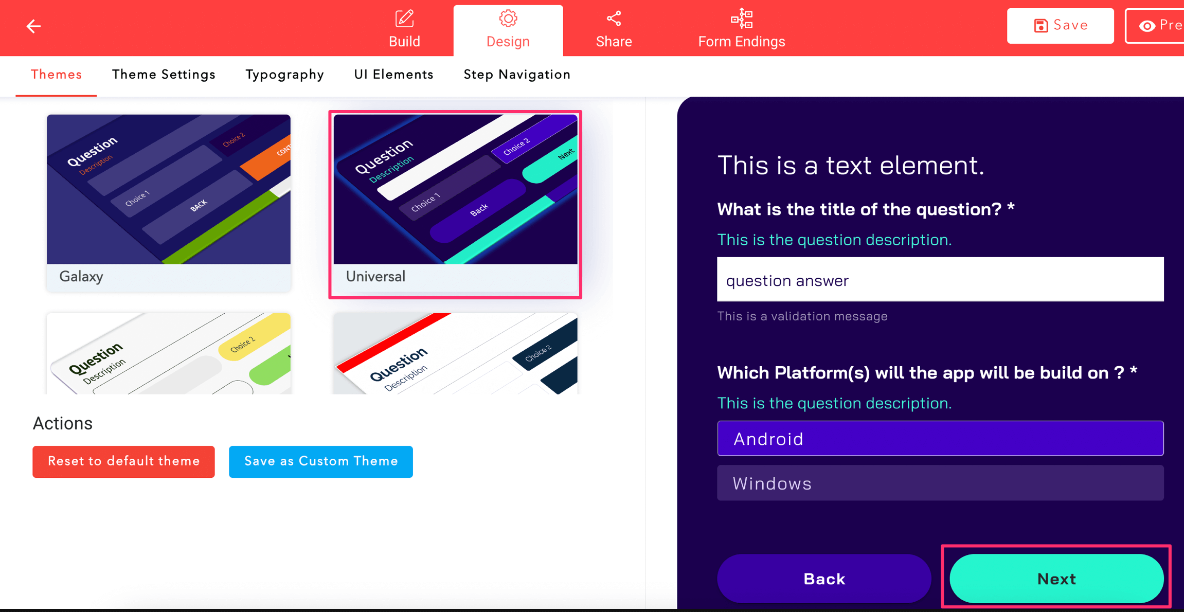 Based on the theme selected on the left, you will see the design of the “Continue” button in the bottom right corner in the preview window.