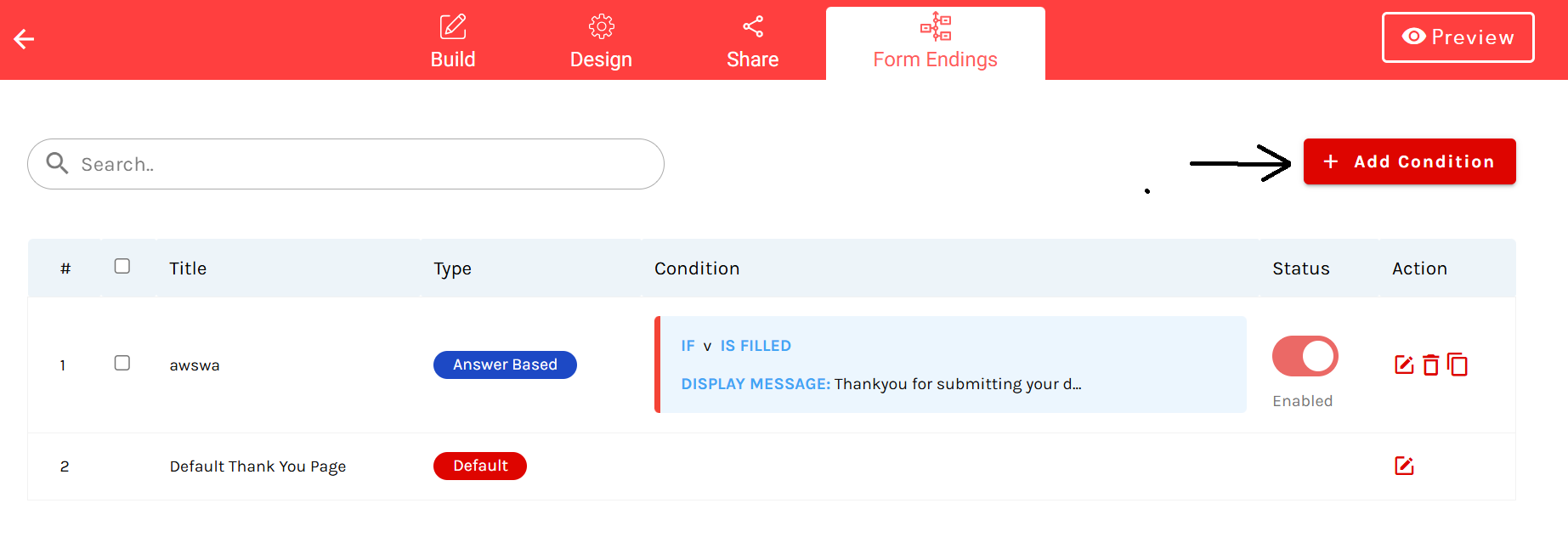 Note: Only one type of ending can be added to a form i.e. either answer-based or visitor-based. If an answer-based ending is enabled, on adding a visitor-based ending, all answer-based conditions will be disabled.